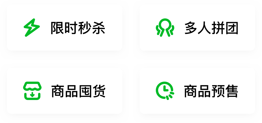 包含商品预售、囤货、限时秒杀、多人拼团热门电商促销活动玩法